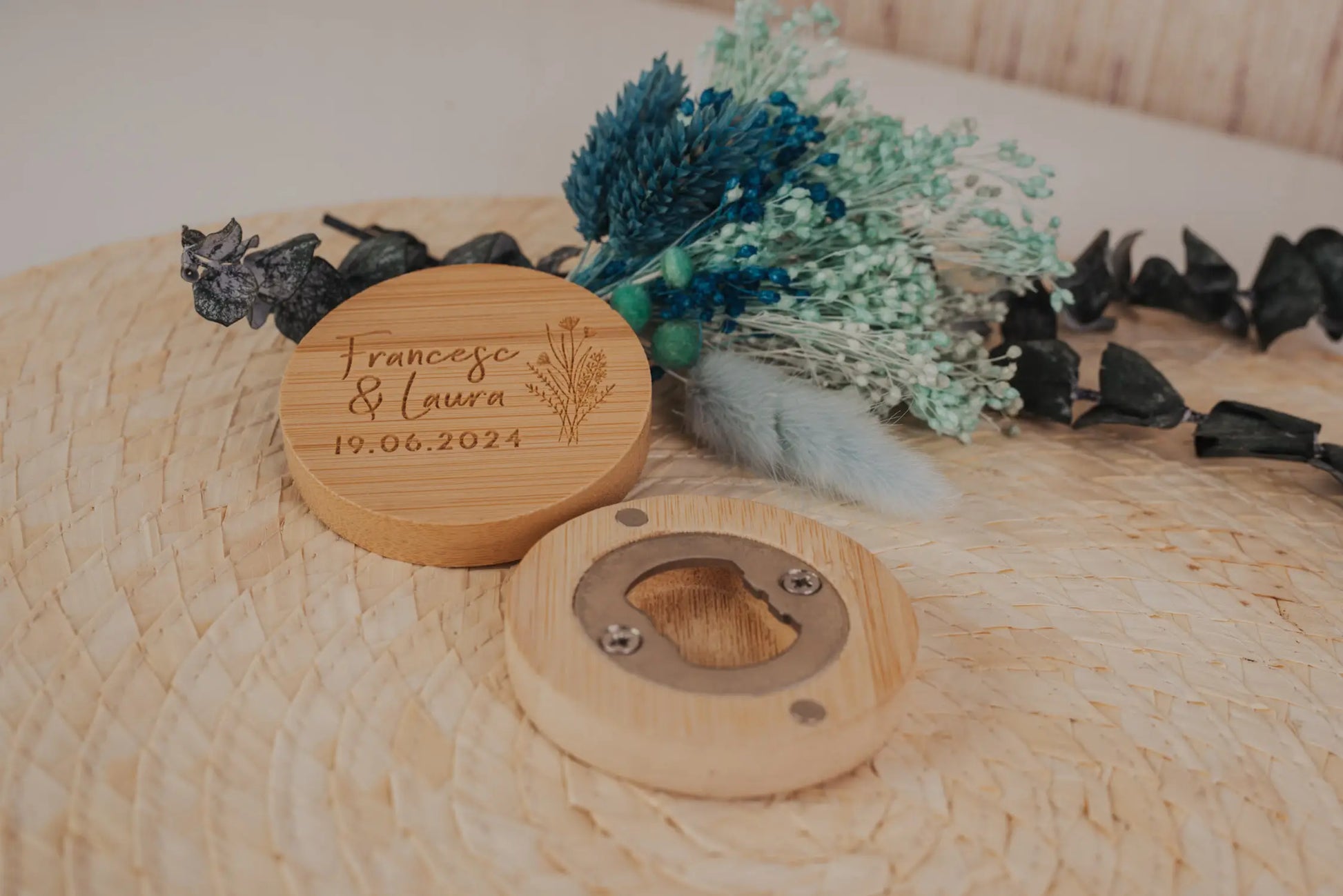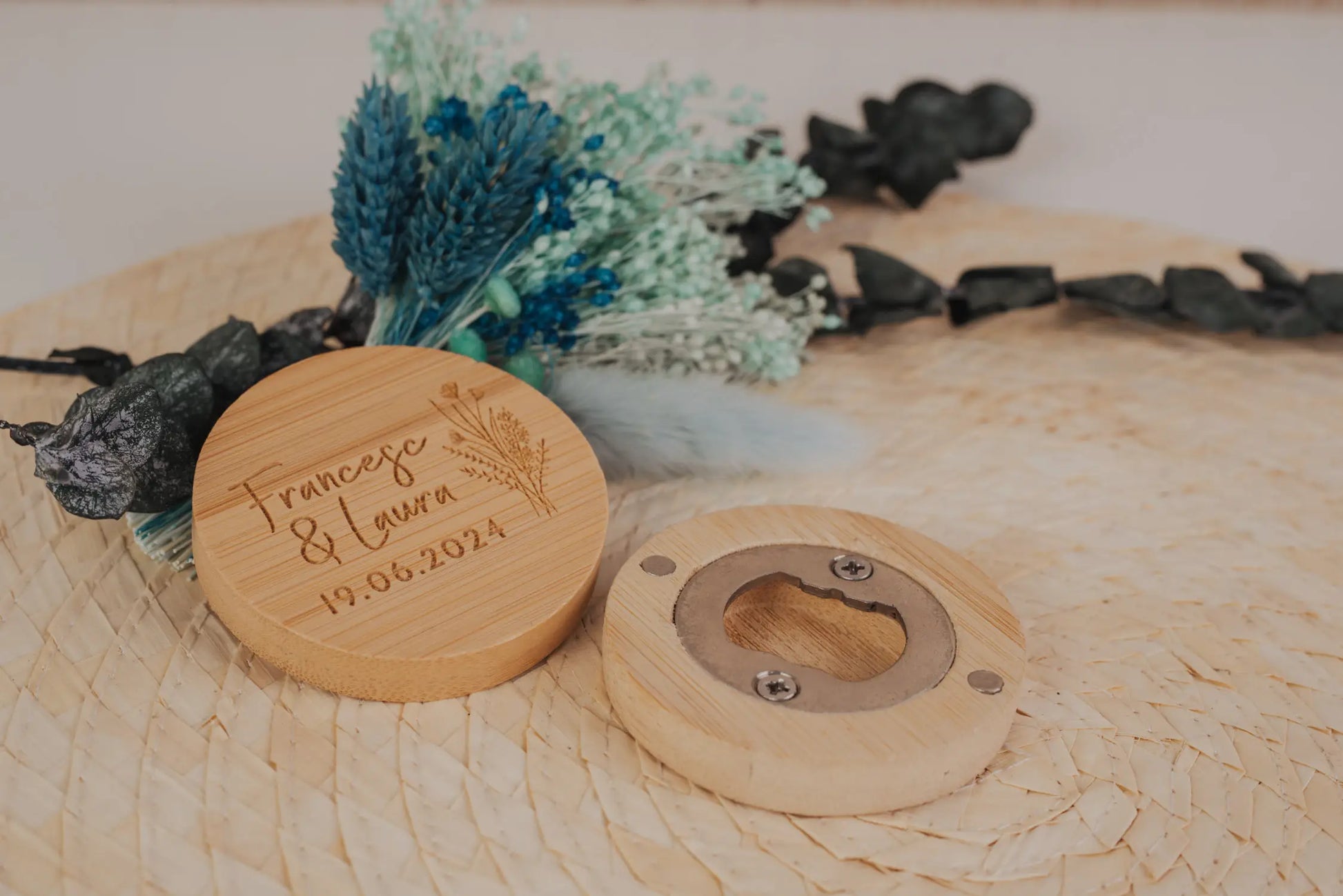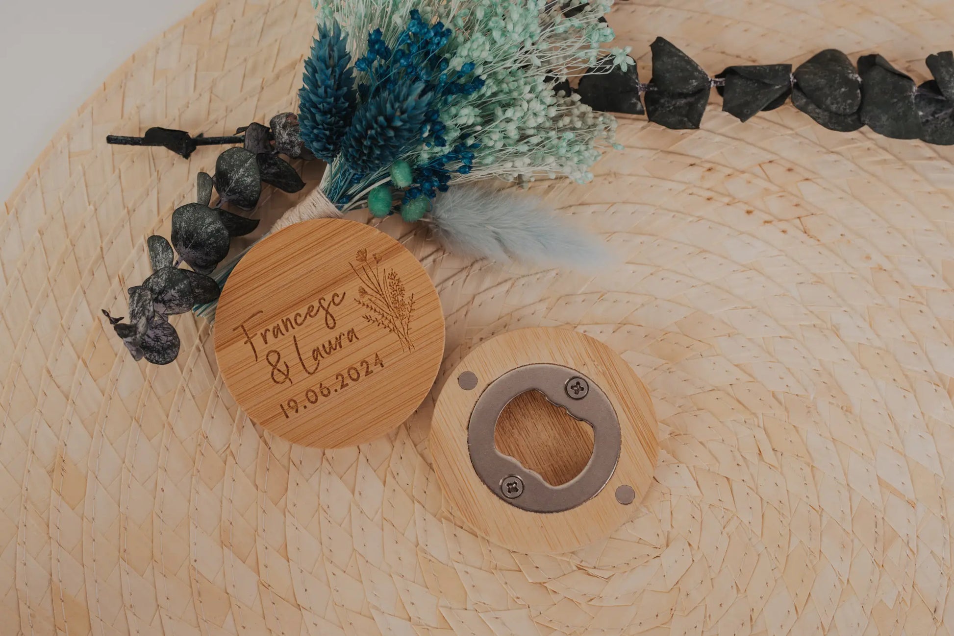 Fabricado con bambú natural, este abrebotellas es ligero y funcional, con un diámetro de 6 cm y un peso de 25 gramos, lo que lo convierte en un accesorio práctico y encantador. El grabado láser asegura que los detalles de los nombres, la fecha y el diseño elegido quedarán impresos con precisión y durabilidad, creando un recuerdo inolvidable de tu boda.