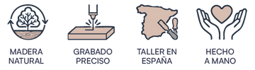 Nos ponemos manos a la obra en el taller. Cortamos y grabamos sobre madera natural y rematamos cada pieza a mano para que el acabado sea suave y perfecto para regalar.