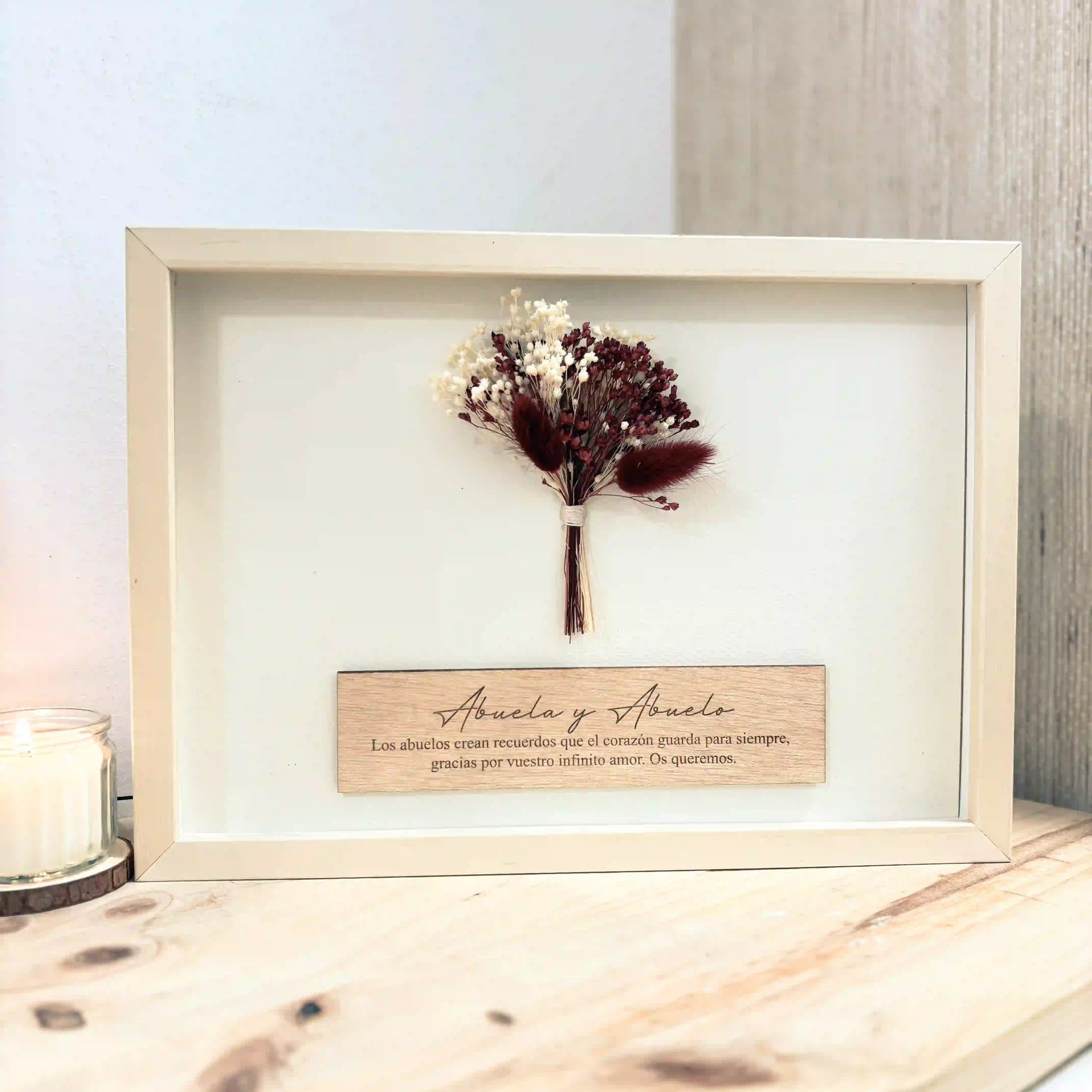El cuadro está delicadamente confeccionada a mano con una selección de flores preservadas que más se ajusten a la paleta de colores de tu ramo de boda y la placa de madera grabada con ese mensaje único y especial.