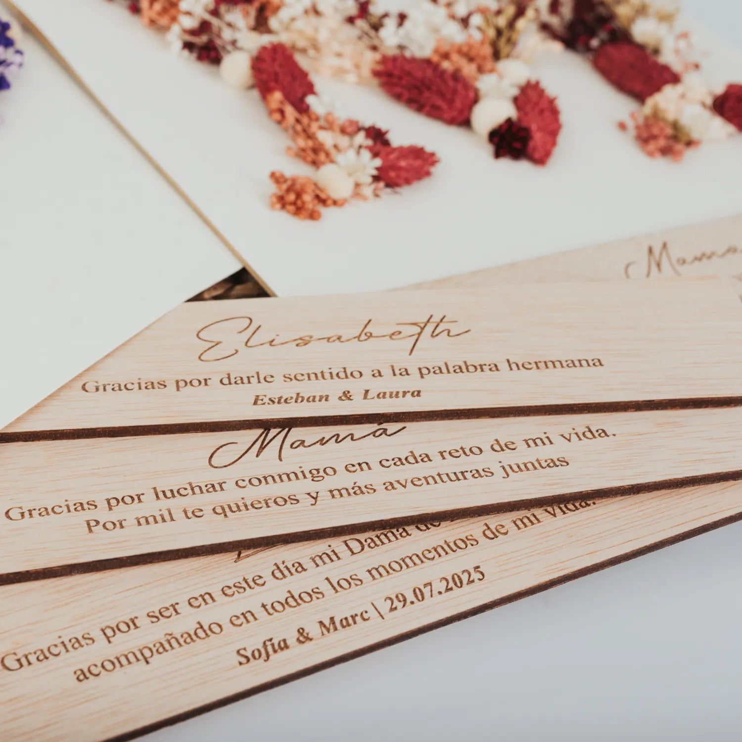 Tendrás que elegir el mensaje que quieres añadir en la placa de madera que va justamente abajo. Seguro que será el centro de atención en cualquier pared y un recordatorio constante de vuestra unión, amor y amistad. Sorpréndelas en tu gran día y regálales un tesoro lleno de amor y recuerdos. ¡No te arrepentirás de ver sus caras iluminarse con lágrimas de alegría!