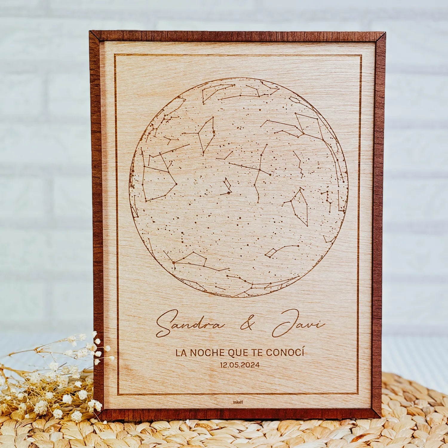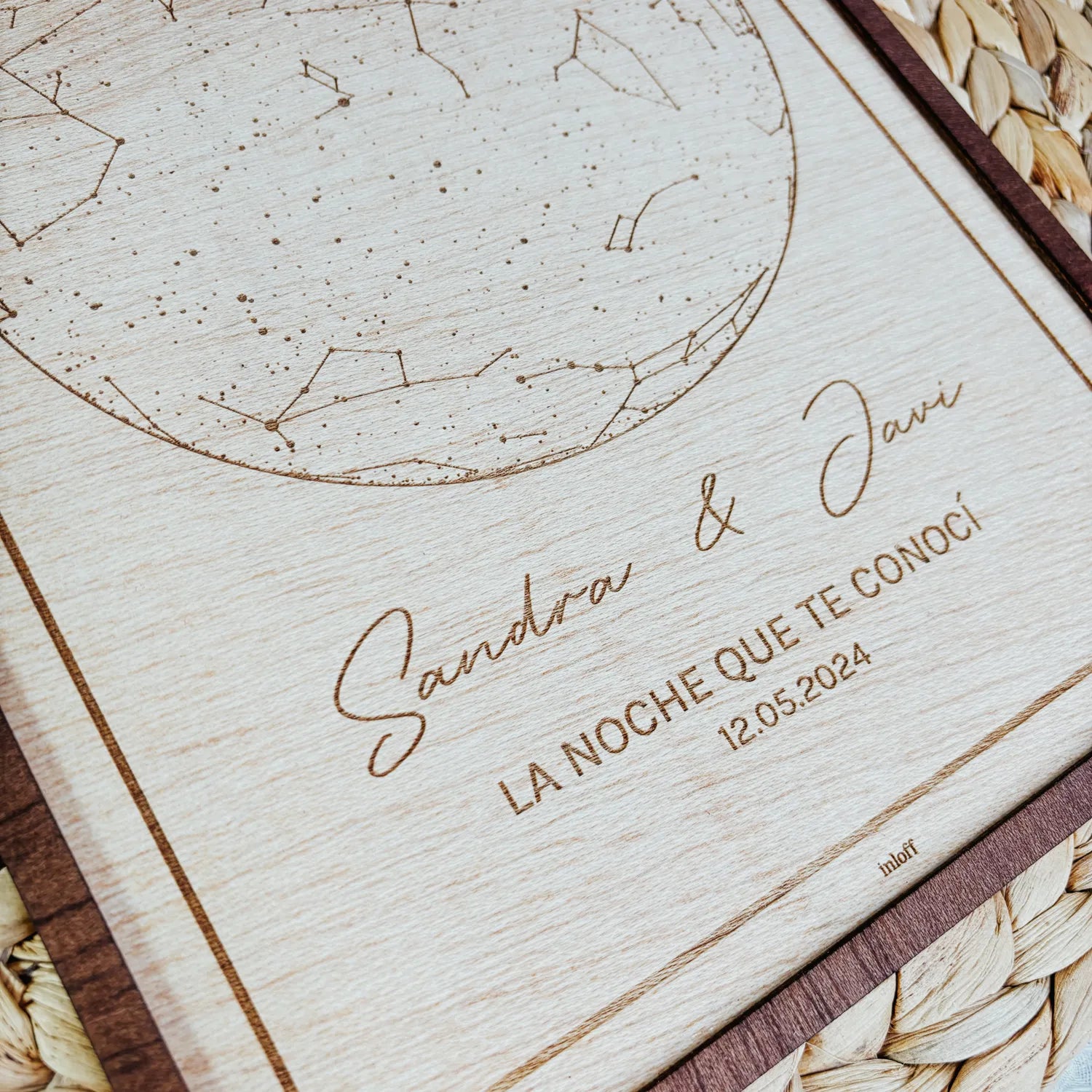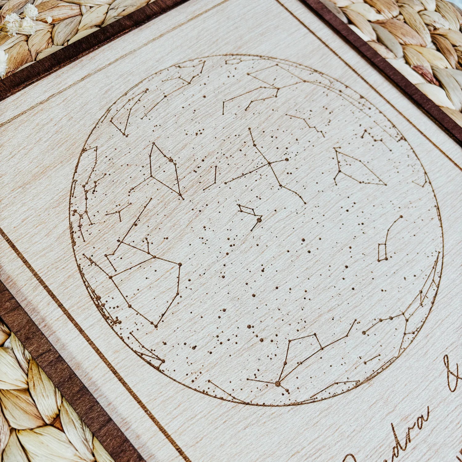 - Grabado láser: Representa con precisión las constelaciones y el cielo nocturno según las coordenadas, fecha y hora exactas que nos indiques.