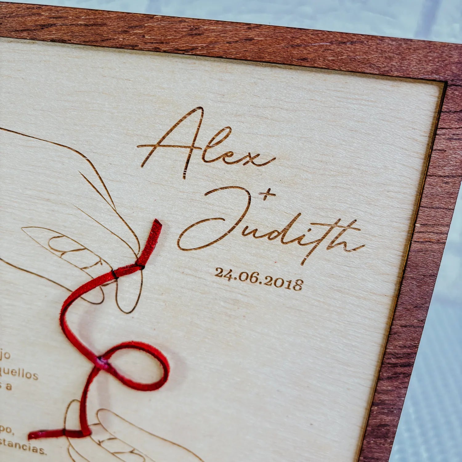 🎁 Un recuerdo lleno de significado: Con detalles grabados a láser y un toque artesanal con el hilo rojo, este cuadro es perfecto para decorar vuestro hogar y mantener siempre viva la llama de vuestra conexión especial.