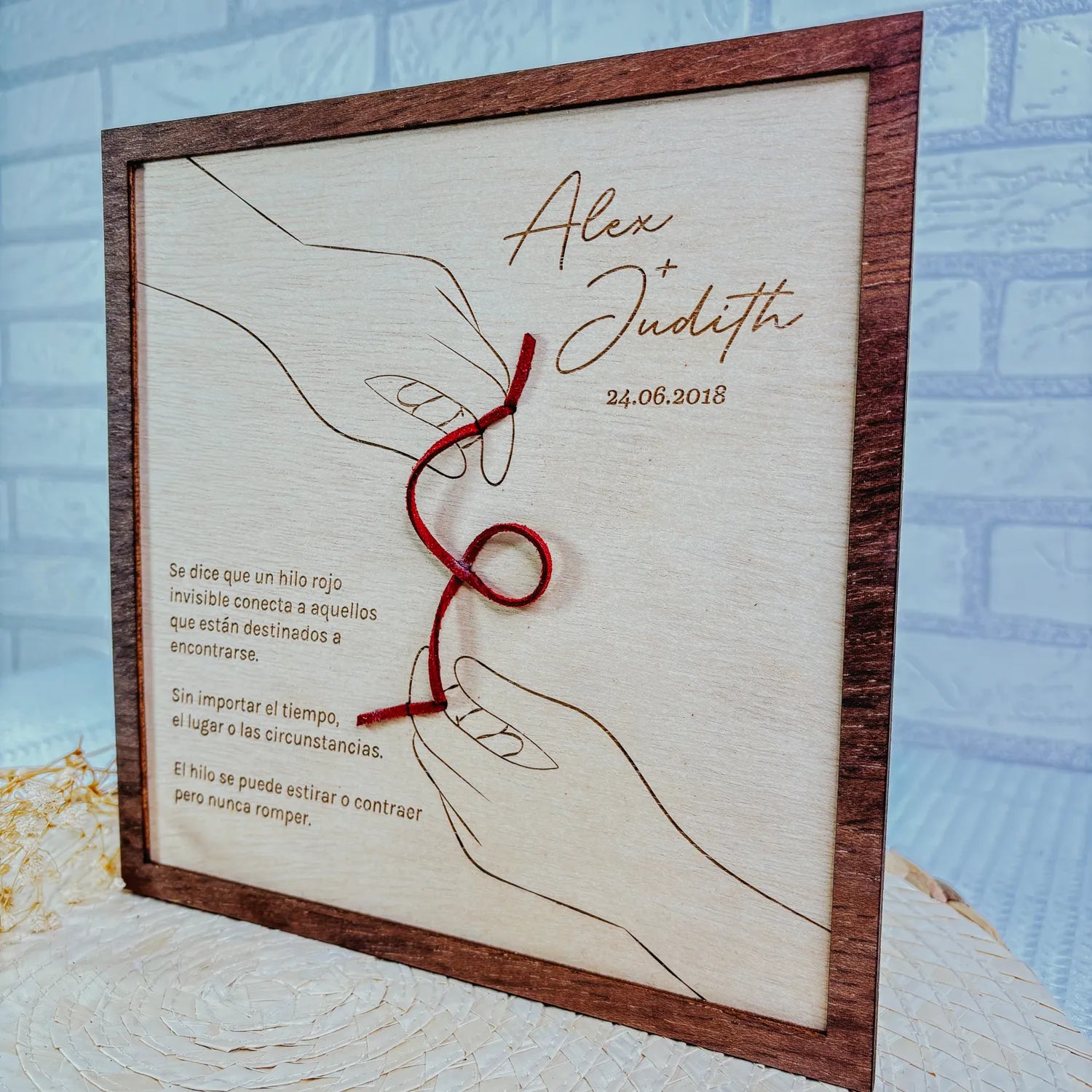 🌟 Un diseño cargado de simbolismo: Confeccionado en contrachapado de alta calidad y enmarcado con un elegante marco teñido con tintes sostenibles, el diseño central muestra dos manos unidas por un hilo rojo real. Según la leyenda, este hilo invisible conecta a las personas destinadas a estar juntas, sin importar el tiempo, la distancia o las circunstancias.