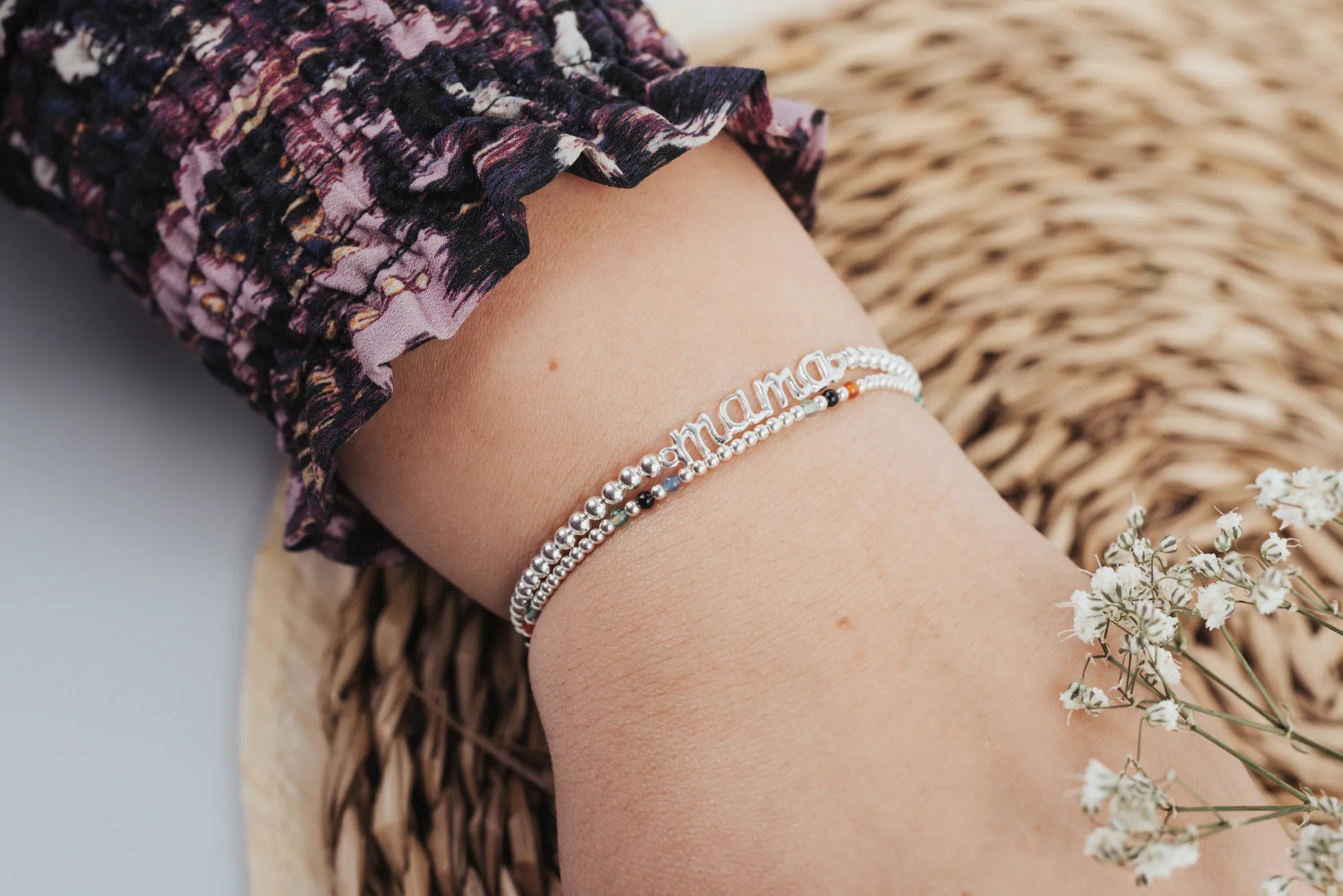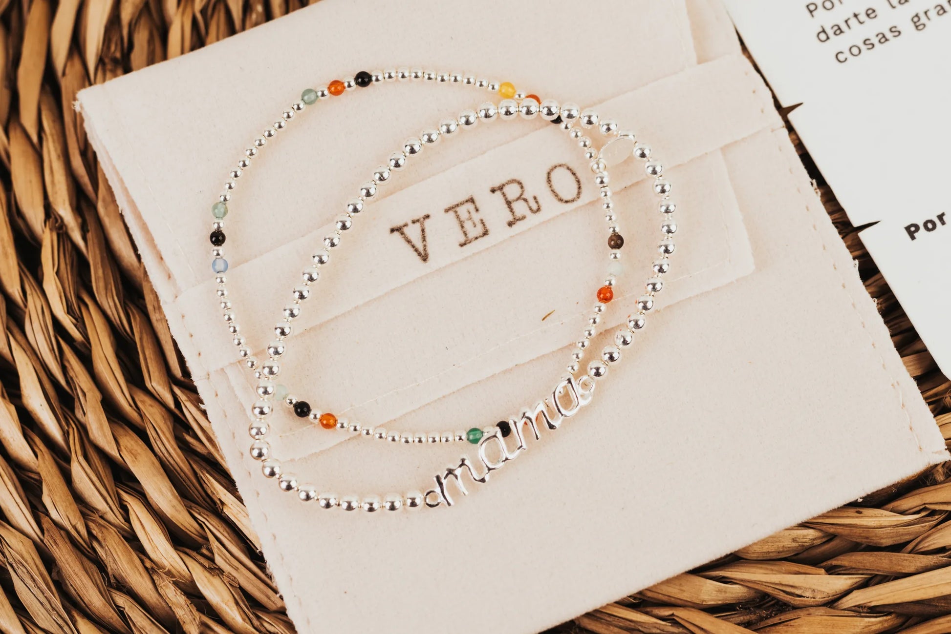 Confeccionadas con materiales de alta calidad, cada detalle de estas pulseras ha sido cuidadosamente diseñado para capturar la esencia del amor maternal. La primera pulsera presenta letras de 28x5mm que deletrean "Mamá", mientras que la segunda pulsera, elástica y con bolitas de 2mm, complementa perfectamente el conjunto.