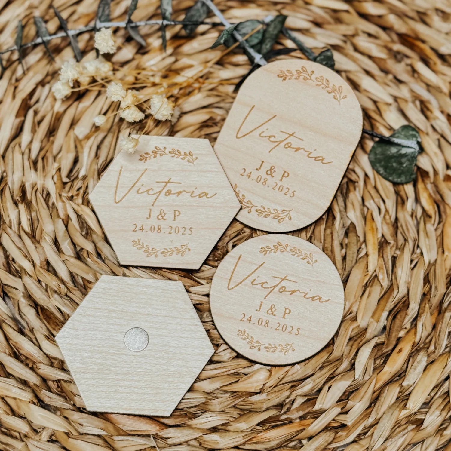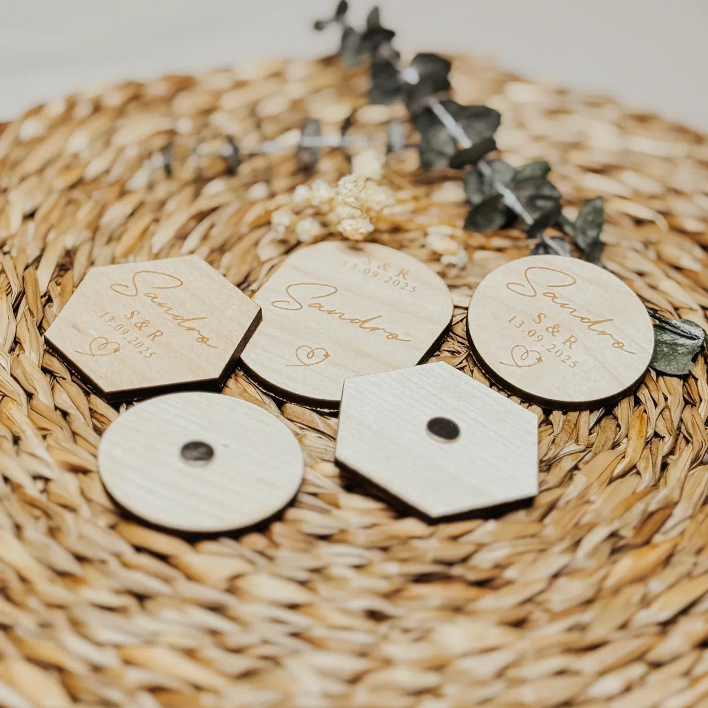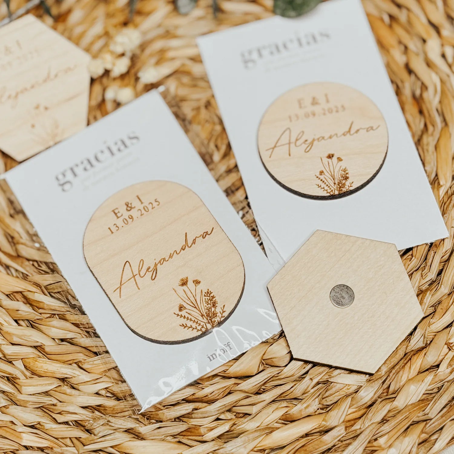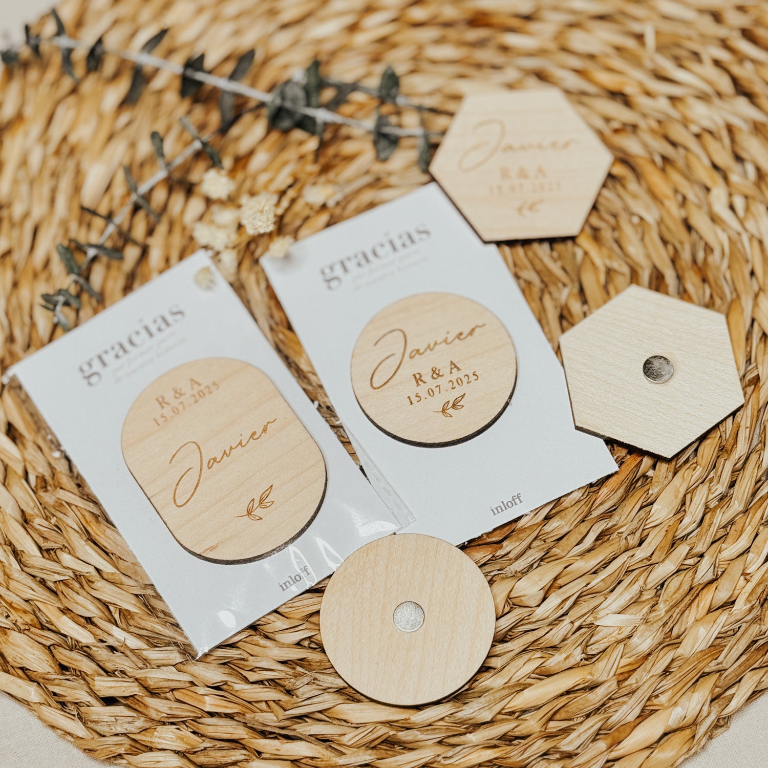 ¿Buscas un detalle que haga sonreír y a la vez sea práctico? Nuestros imanes de madera natural personalizados son el recuerdo perfecto para tu boda. Cada imán se elabora con mimo, grabando los nombres de tus invitados, vuestras iniciales y la fecha de ese día tan especial.