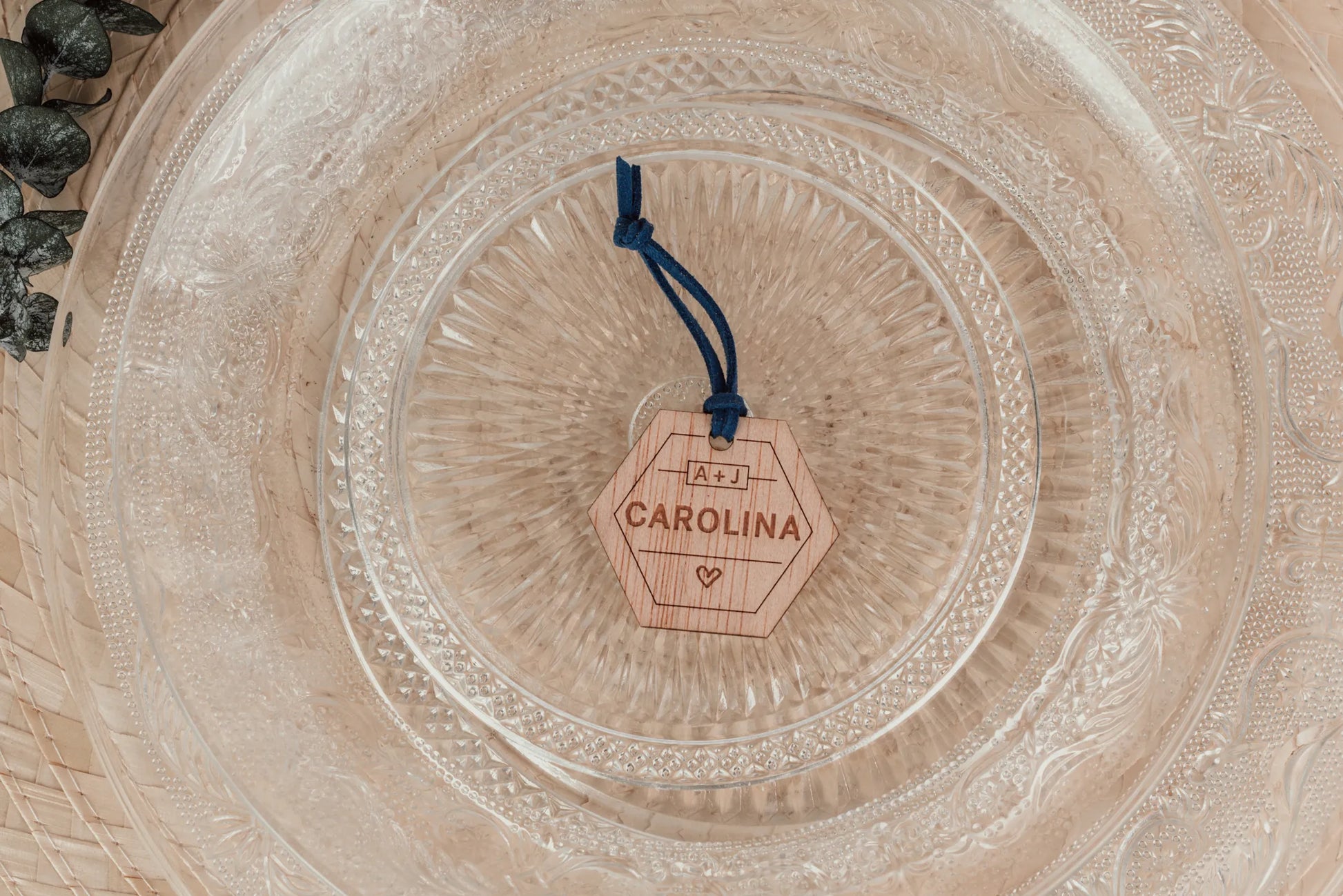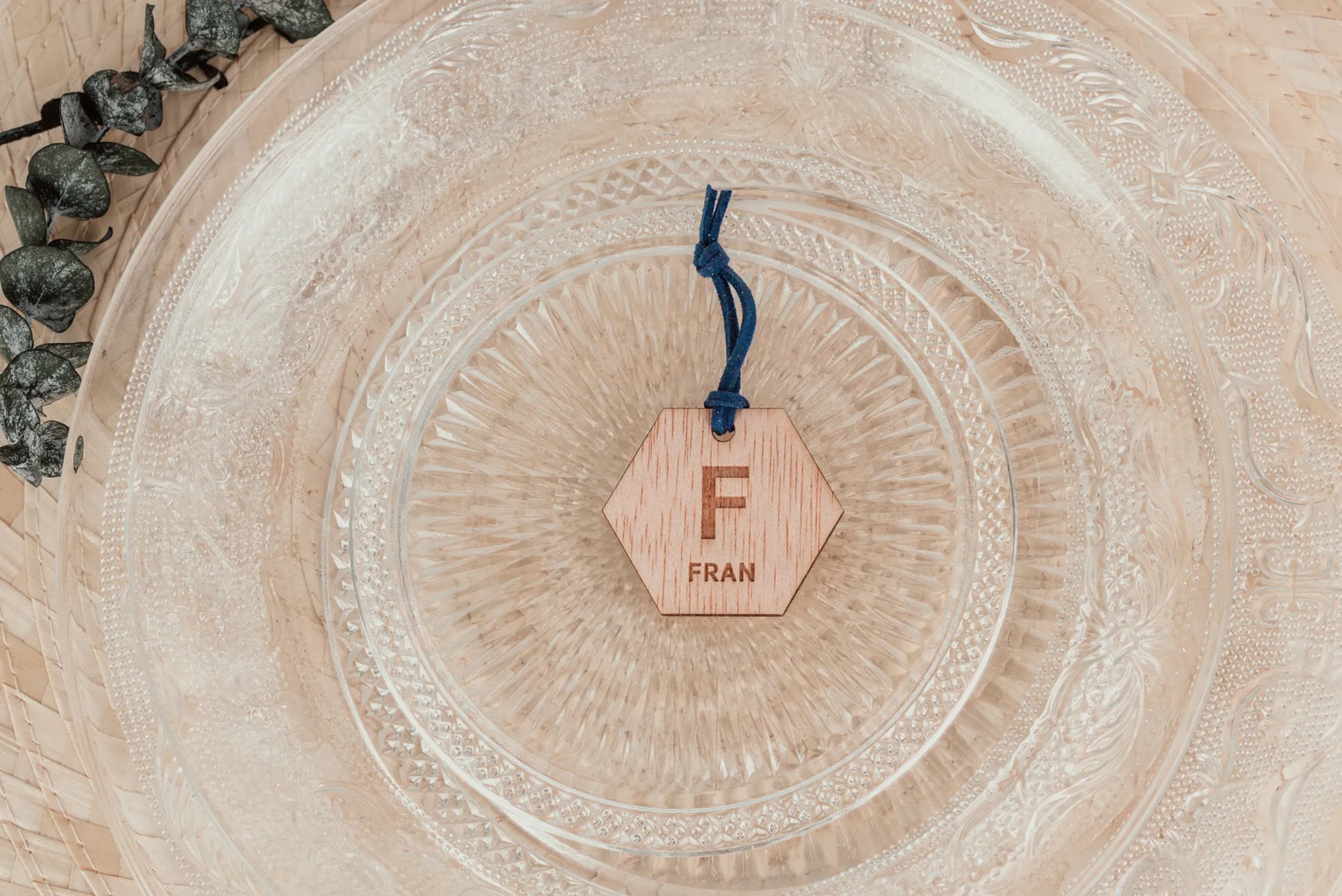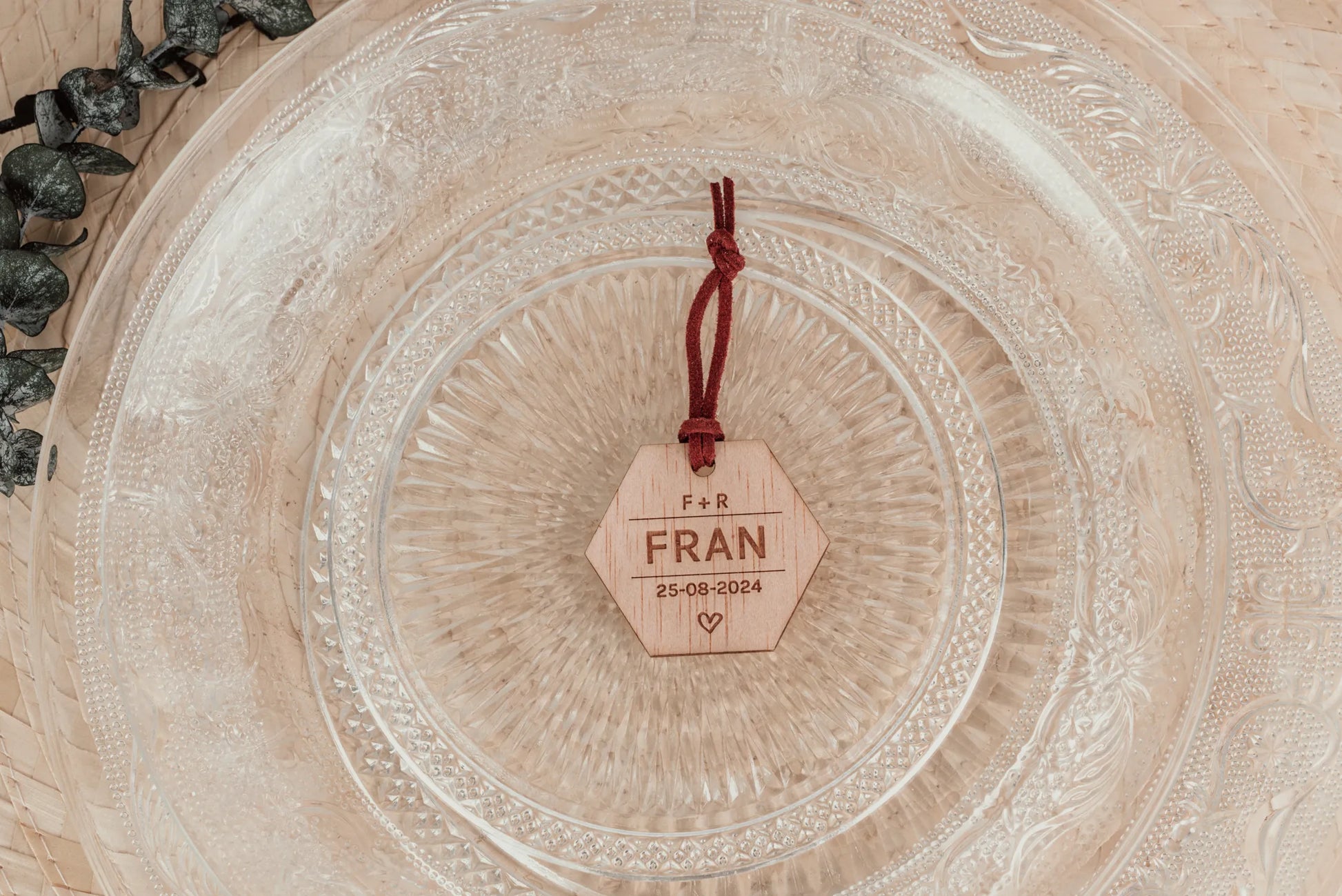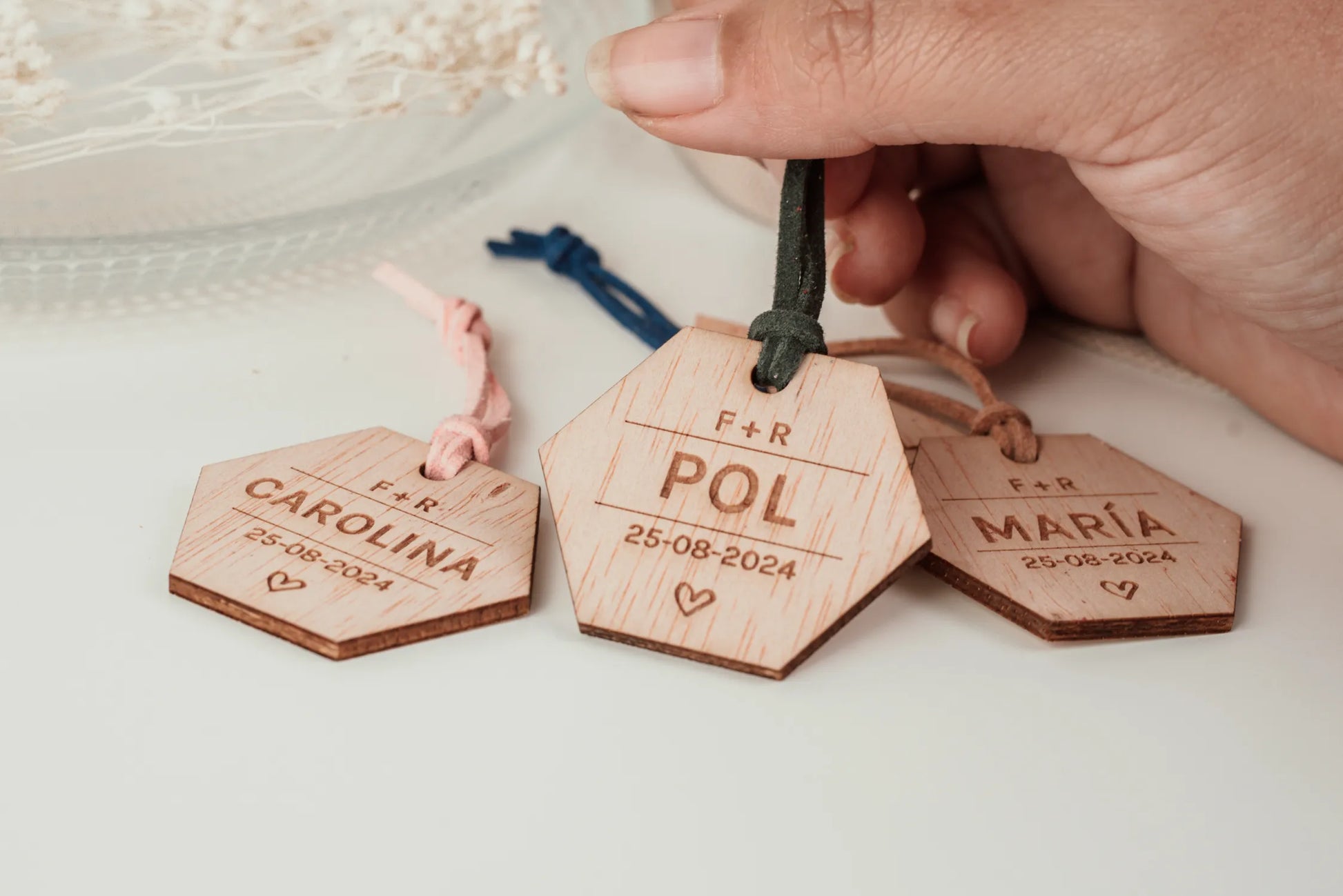 El tacto suave de la madera y el diseño geométrico minimalista se combinan para crear un accesorio que es tanto práctico como estéticamente agradable. La cuerda de ante, disponible en una gama de colores, añade un toque de personalización adicional que permite elegir el que más se ajuste a cada invitado de tu boda.
