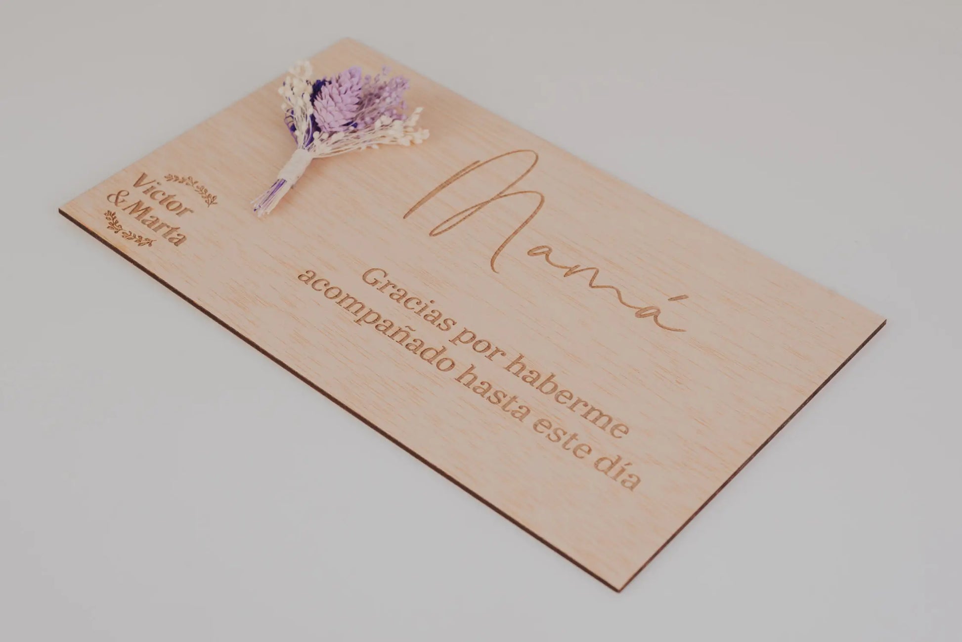 La placa, confeccionada con madera contrachapada, es un recordatorio tangible de vuestra gratitud y cariño. Cada vez que la vean, recordarán el amor y la felicidad que se respiraba en vuestro gran día. Además, añadimos un pequeño ramillete de flores preservadas a tu elección para que le des un toque único.
