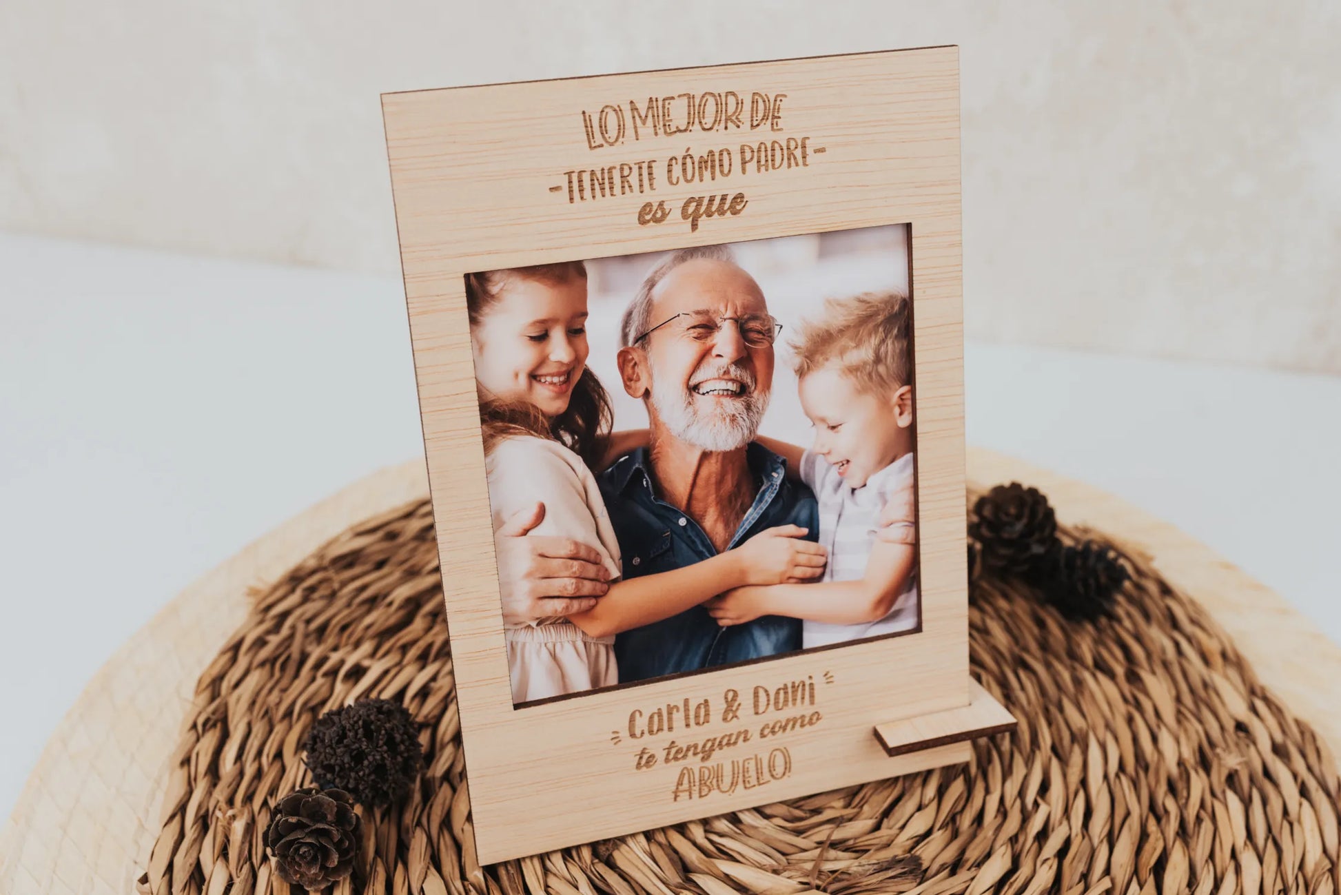 Pero eso no es todo, a la foto, le acompaña una estupenda frase para dedicar: "Lo más maravilloso de tenerte como padre es que te tengan como abuelo". Podrás personalizarla con los nombres de los nietos para hacerlo aún más único y emotivo. 🥇💖