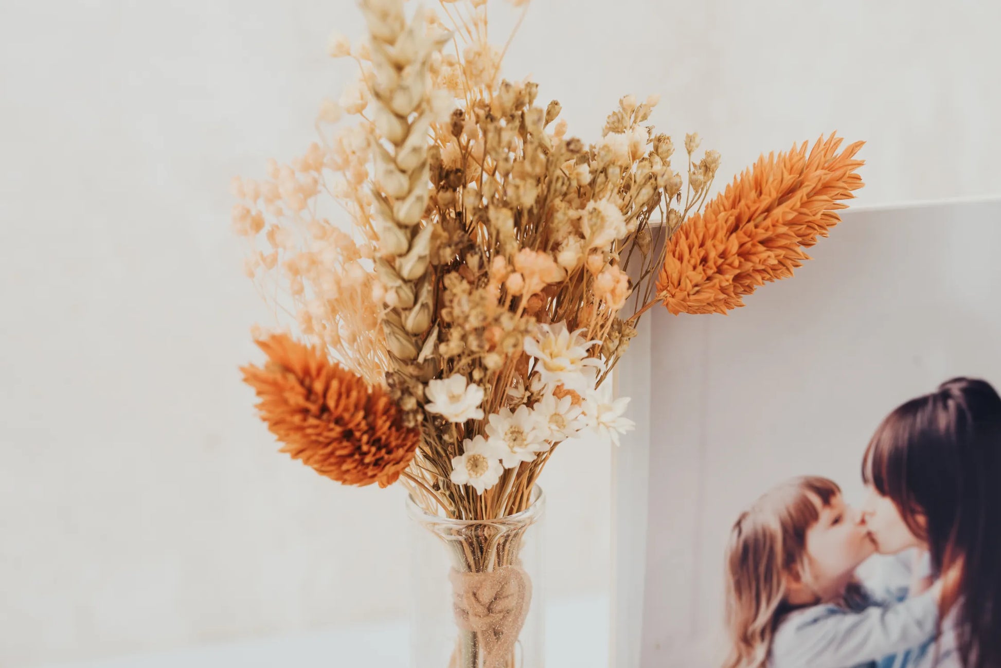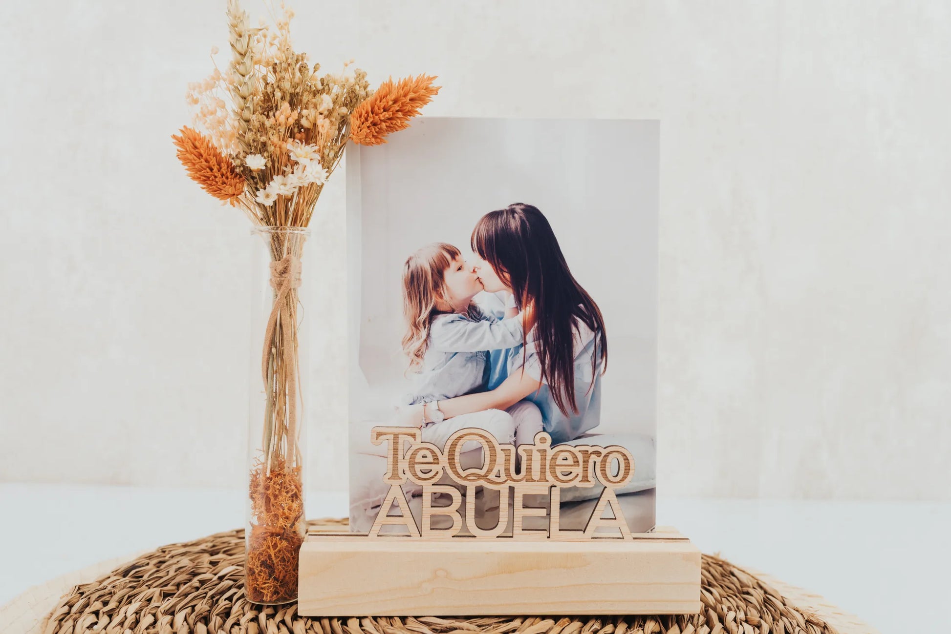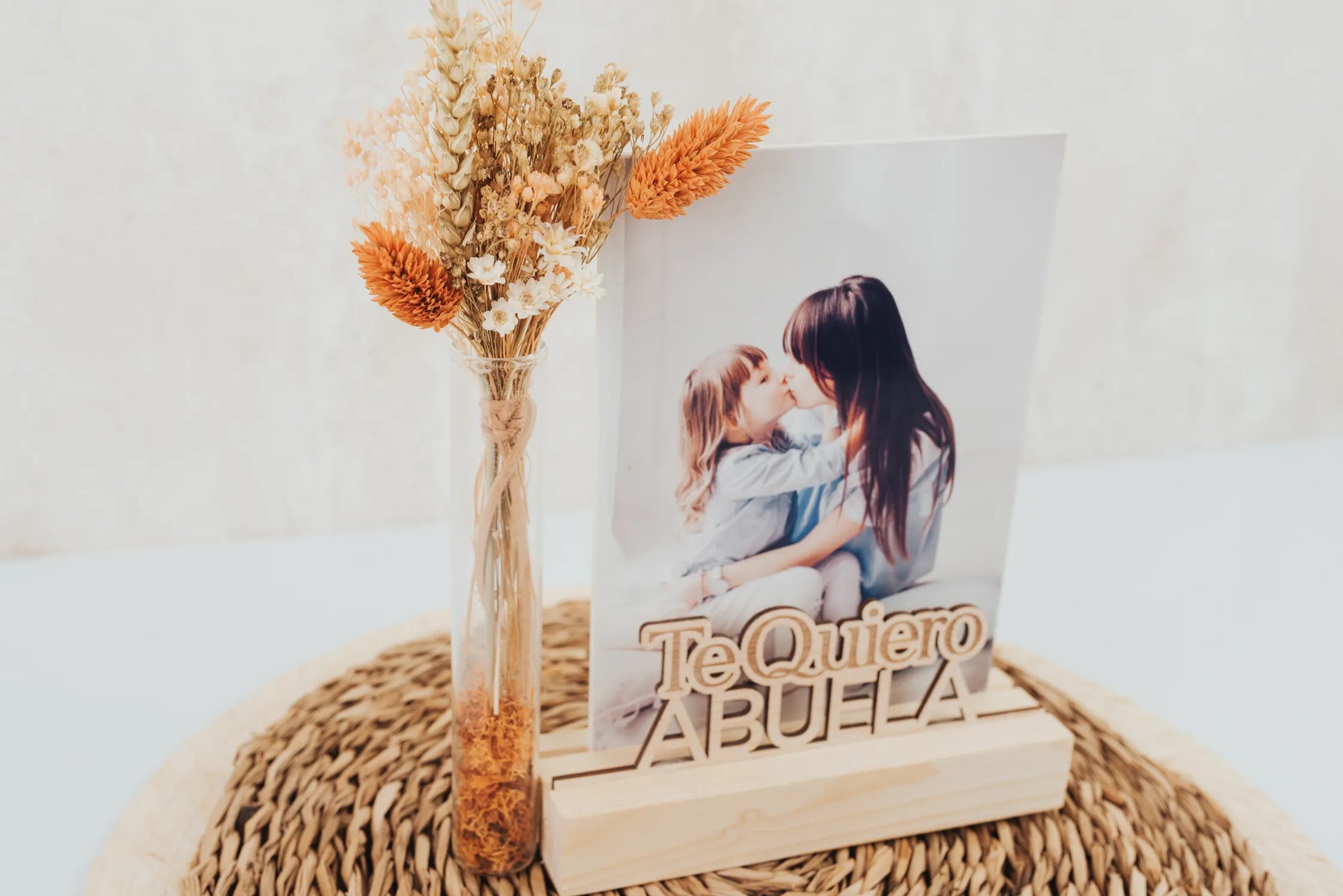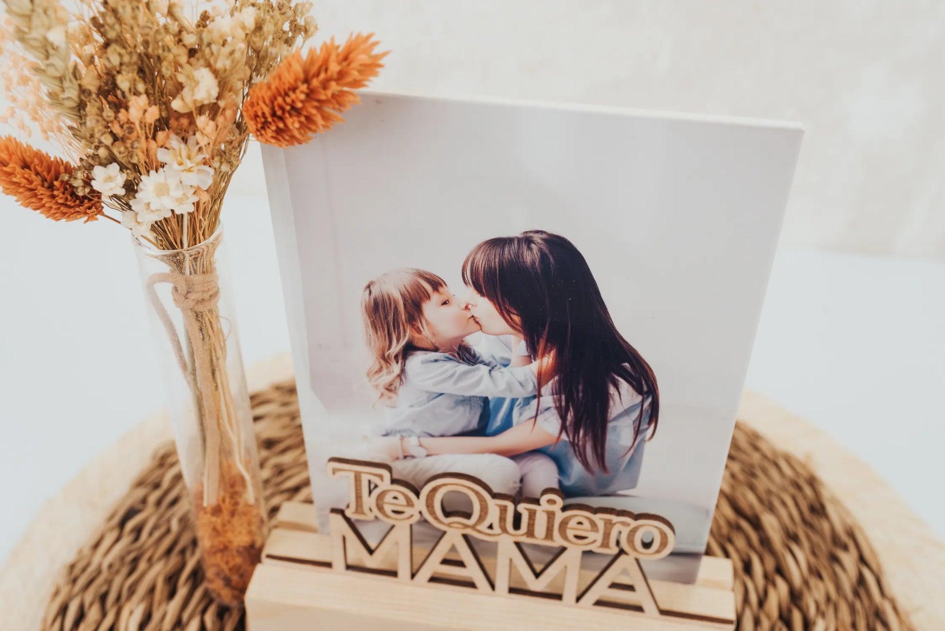 Imagina la cara de ilusión de mamá al descubrir no solo una fotografía impresa en papel fotográfico de alta calidad sobre un soporte rígido sino también un delicado arreglo floral eterno que incluye margaritas, paniculata y musgo, aportando un soplo de naturaleza y frescura al rincón de vuestro hogar que se convierta en su futuro espacio. 📸✨🌿