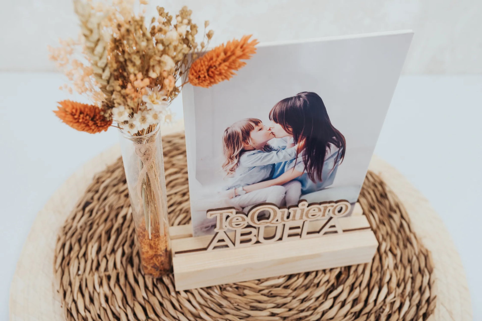 ¡Dale a mamá el homenaje que se merece con nuestra exclusiva peana de fotos de madera, acompañada de un precioso arreglo de flores preservadas! 🏆🌼 Esta base no solo sostiene sus recuerdos más preciados, sino que también te permite añadirle la foto que hará que le llegue al corazón.