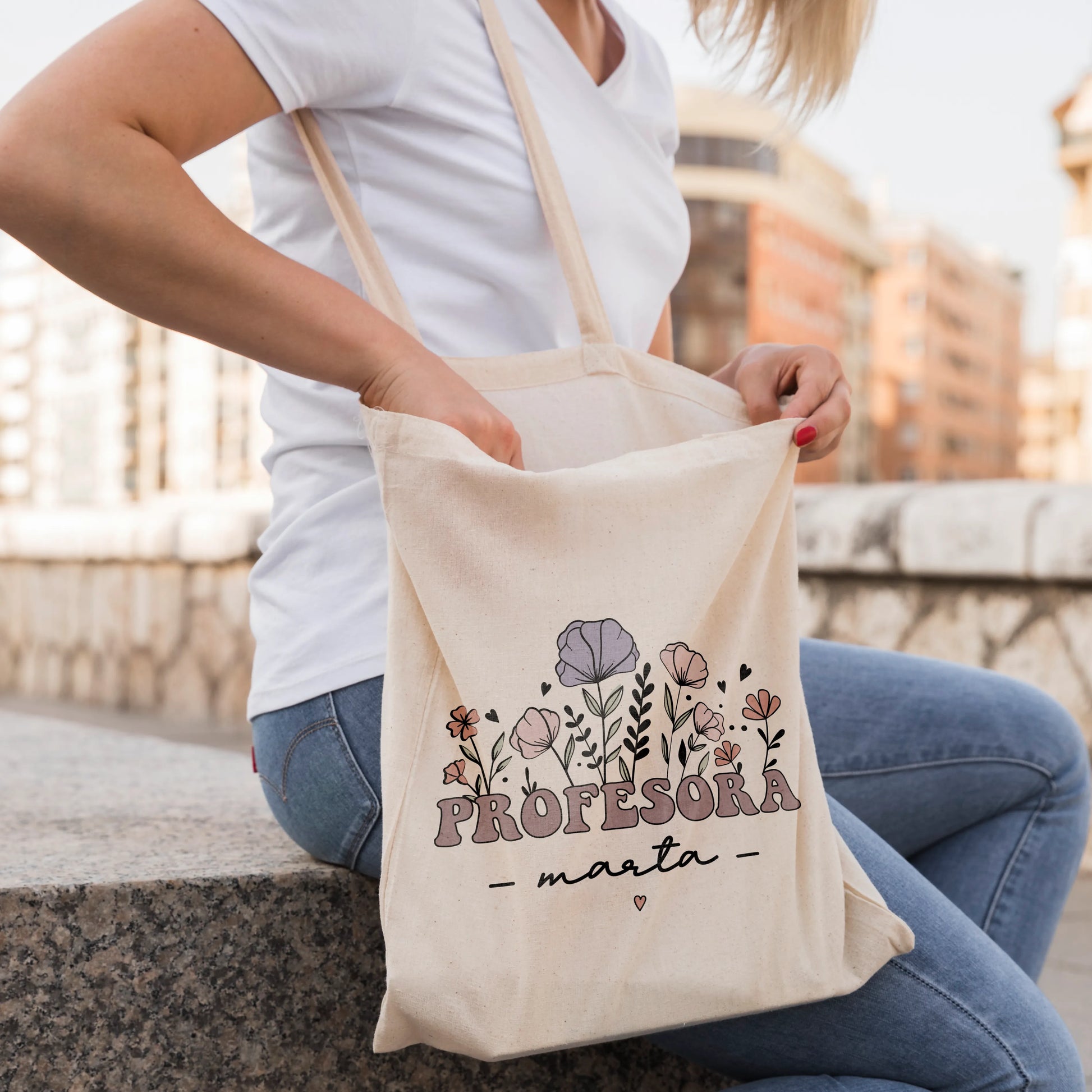 Demuestra tu aprecio con nuestra Totebag Profe "Floral". Esta bolsa de tela, hecha de algodón semi-peinado, es ideal para llevar libros, cuadernos y todo lo necesario para un día de clases. Personalízala con el nombre del profesor para un detalle único y significativo.