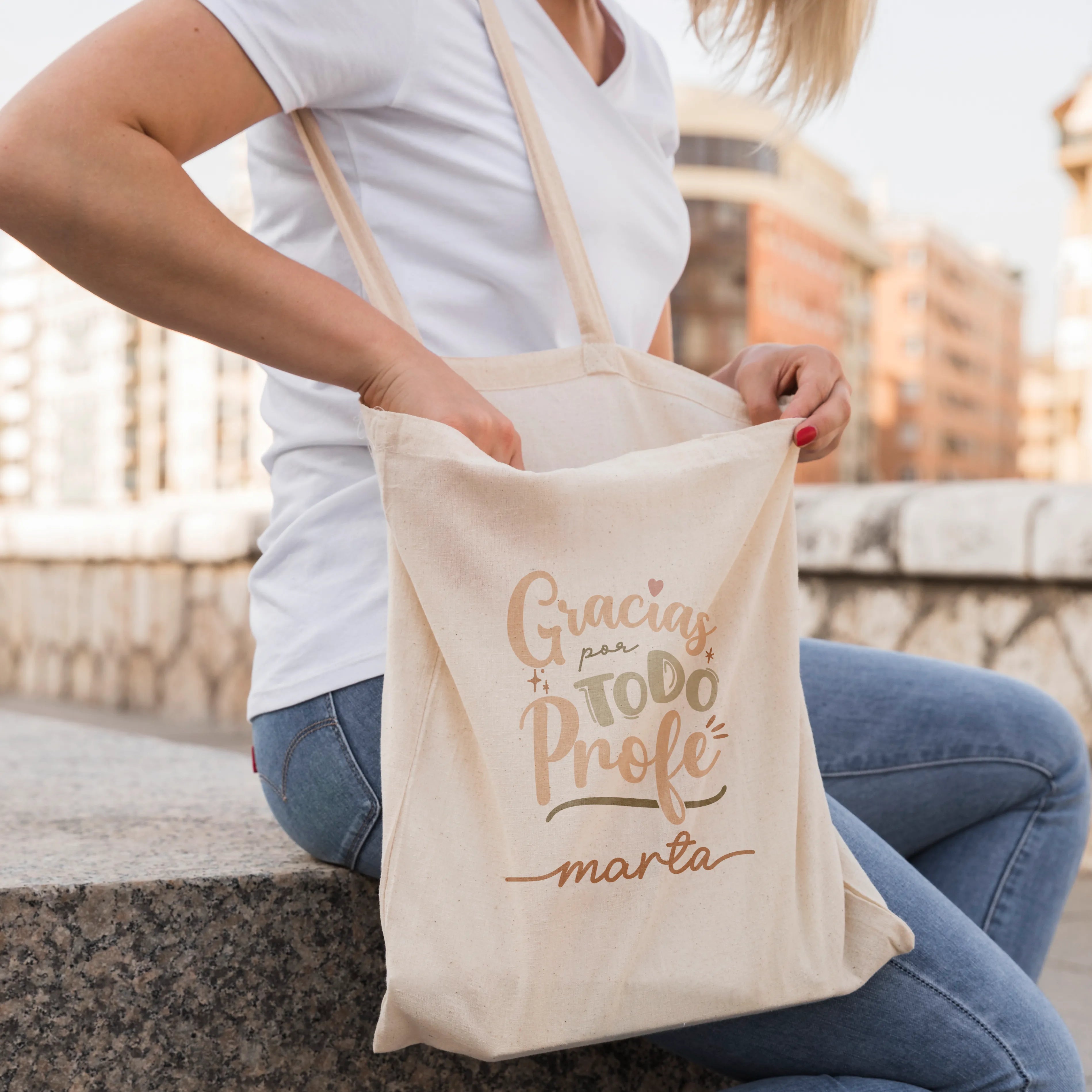 Demuestra tu aprecio con nuestra Totebag Profe "Gracias por Todo". Esta bolsa de tela, hecha de algodón semi-peinado, es ideal para llevar libros, cuadernos y todo lo necesario para un día de clases. Personalízala con el nombre del profesor para un detalle único y significativo.
