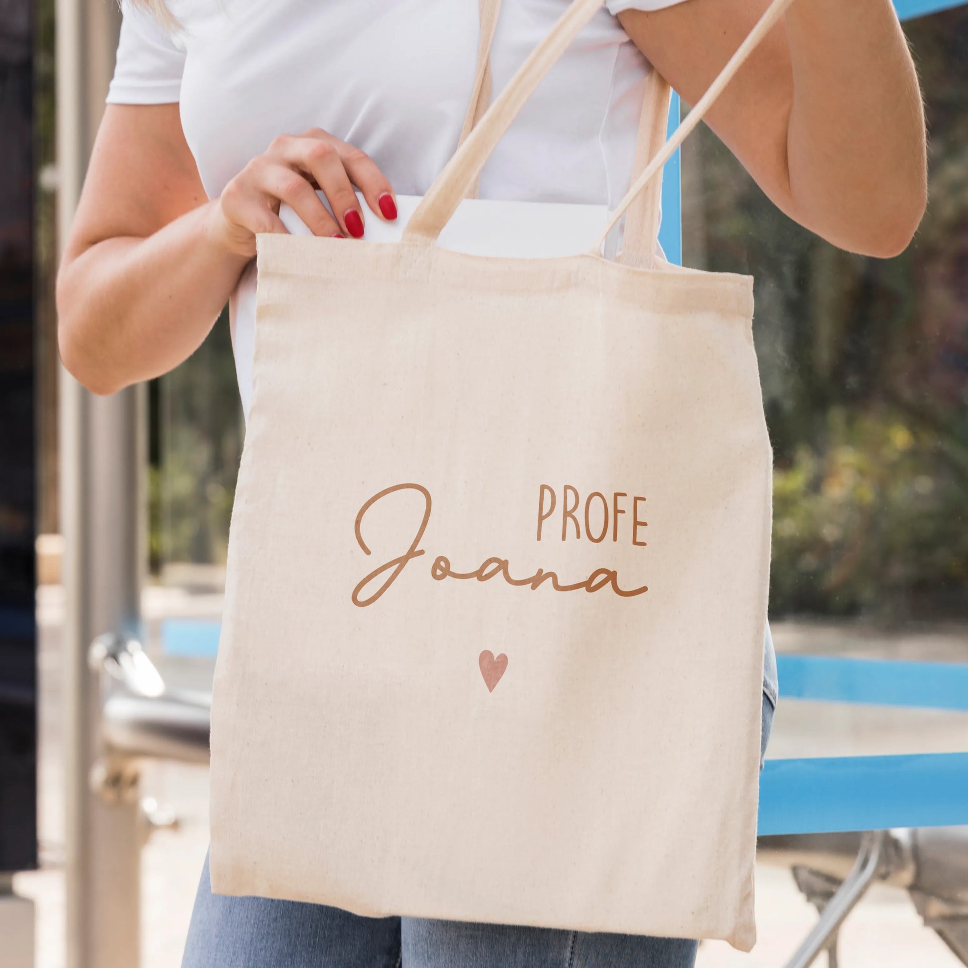 Demuestra tu aprecio con nuestra Totebag Profe "Nombre Profe". Esta bolsa de tela, hecha de algodón semi-peinado, es ideal para llevar libros, cuadernos y todo lo necesario para un día de clases. Personalízala con el nombre del profesor para un detalle único y significativo.